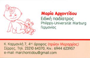 Στο σύγχρονο παιδιατρικό ιατρείο της Μαρίας Αρχοντίδου τα παιδιά αποβάλλουντο άγχος και το φόβο τους για το γιατρό.Στον χώρο αναμονής υπάρχει παιδική γωνιά, όπου οι μικροί επισκέπτεςμπορούν να απασχοληθούν με ευχάριστες δραστηριότητες.