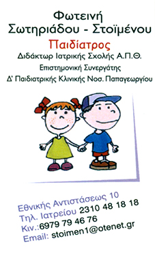 Επιστημονικός Συνεργάτης Δ' Παιδιατρικής ΚλινικήςΝοσοκομείου ¨"Παπαγεωργίου"Δέχεται Δευτέρα και Παρασκευή 10:00-17:00Τρίτη και Τετάρτη 17:00-21:00 με ραντεβού.